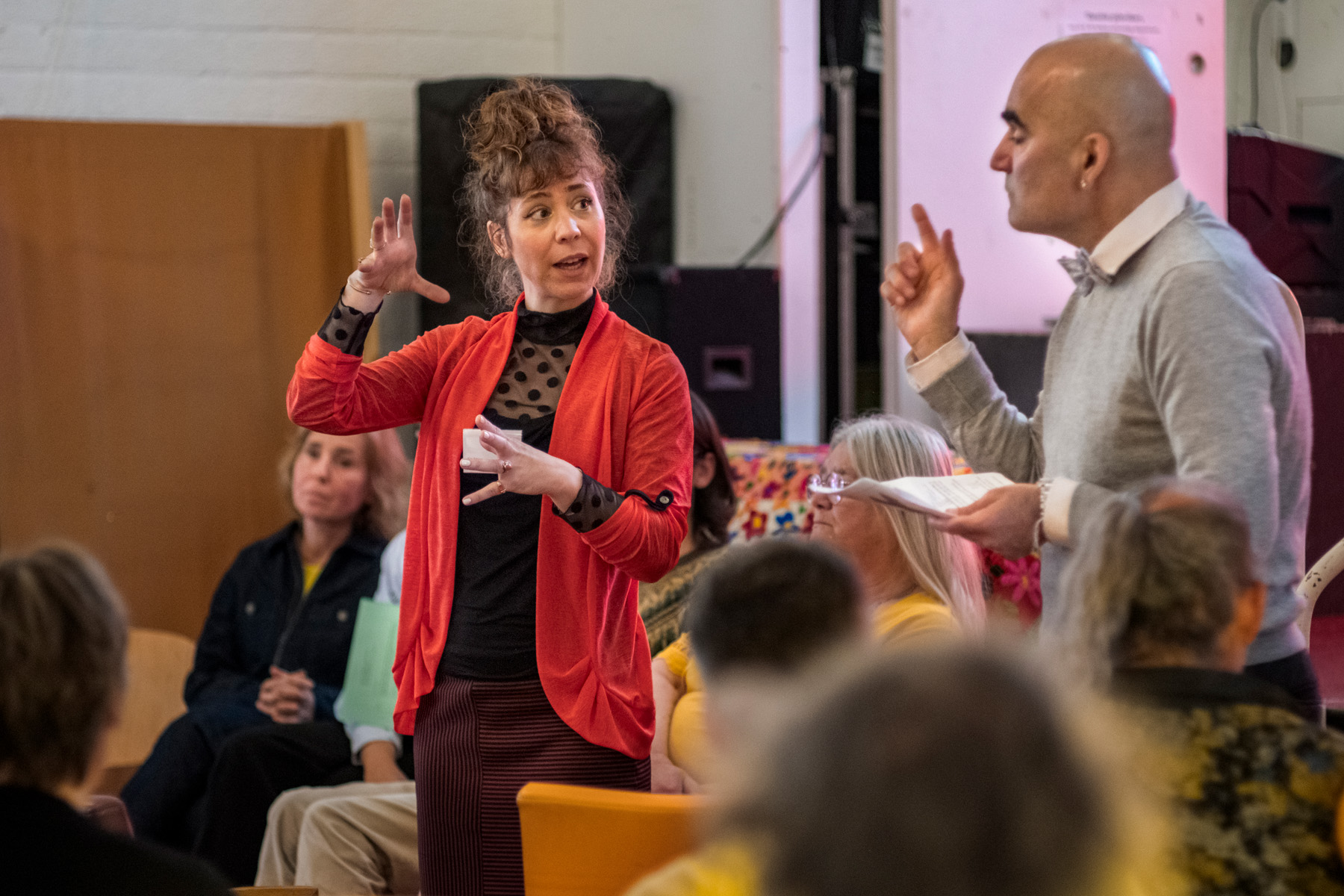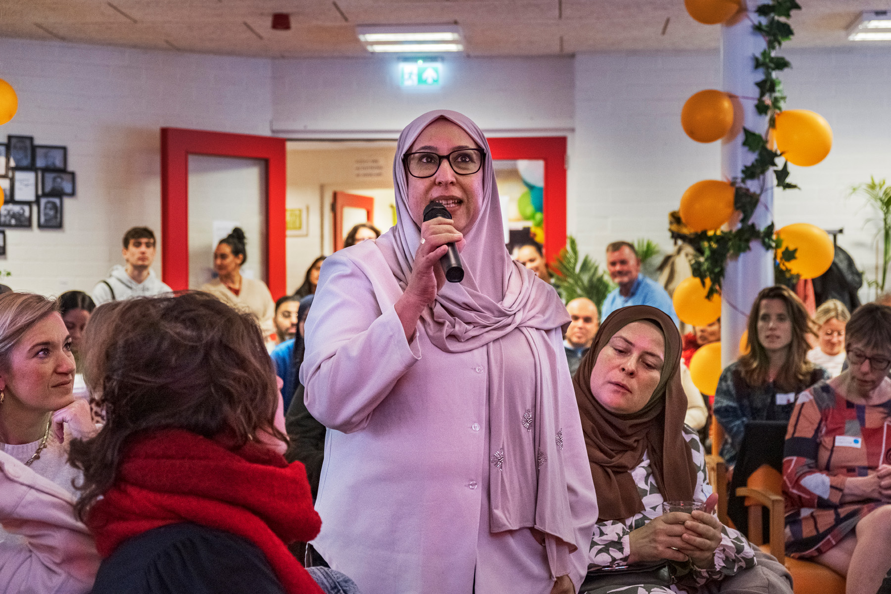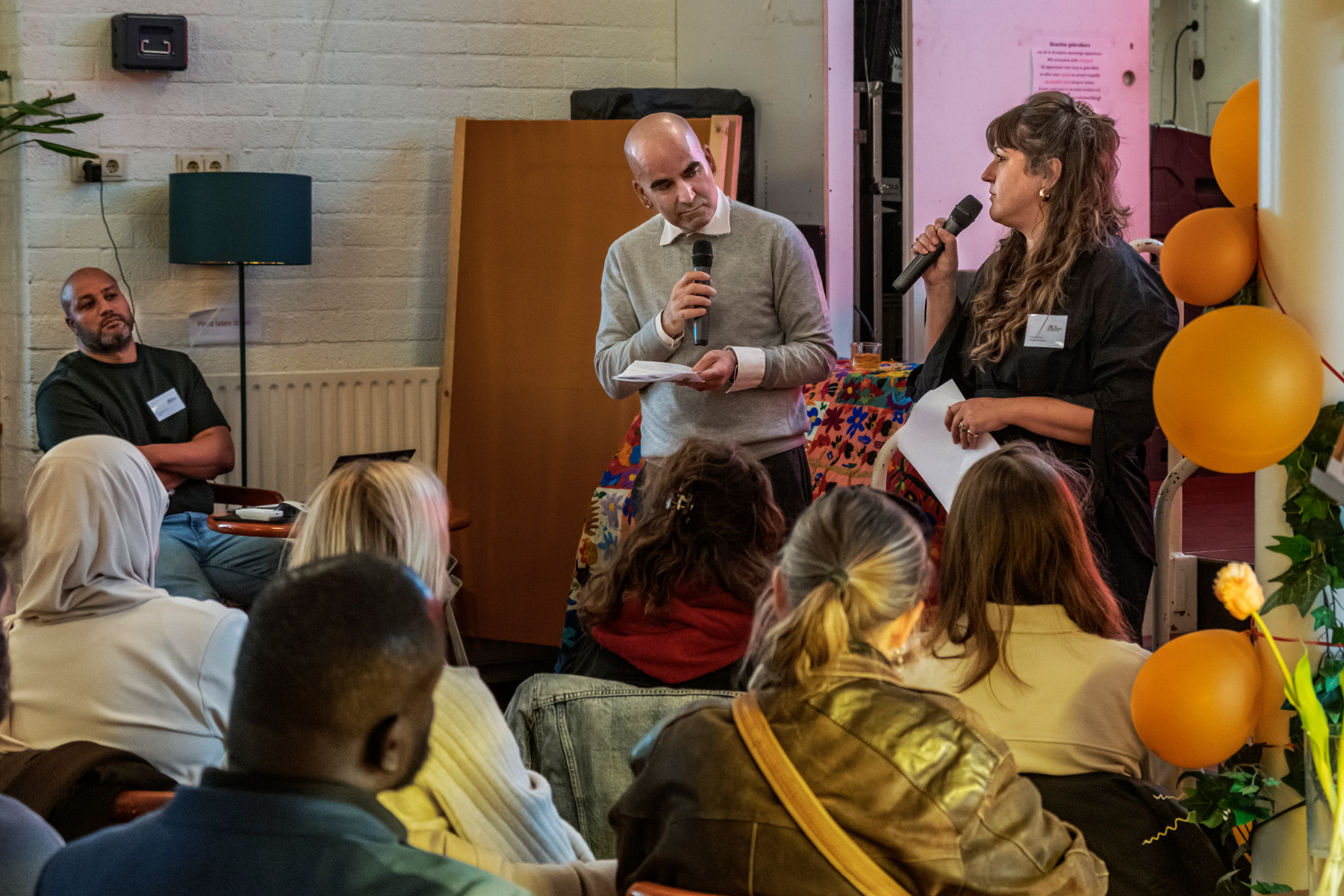 Host Bahram Sadeghi verwelkomde een ieder en wees als eerste op de Sociale Marktplaats: een wand waar je je vraag of aanbod kon ophangen. Daarna vroeg hij Dorine Verheul, procesbegeleider bij Combiwel, op het podium om haar te vragen over de sociale basis. Wat is dat precies? Inmiddels een bekende term voor velen, maar toch goed om nog even te herhalen.